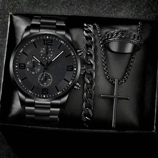 Visualizza tutti i dettagliElegante e completo, questo set da uomo 4 pezzi con orologio al quarzo è la scelta perfetta per chi vuole un look coordinato e moderno. Il set incl...