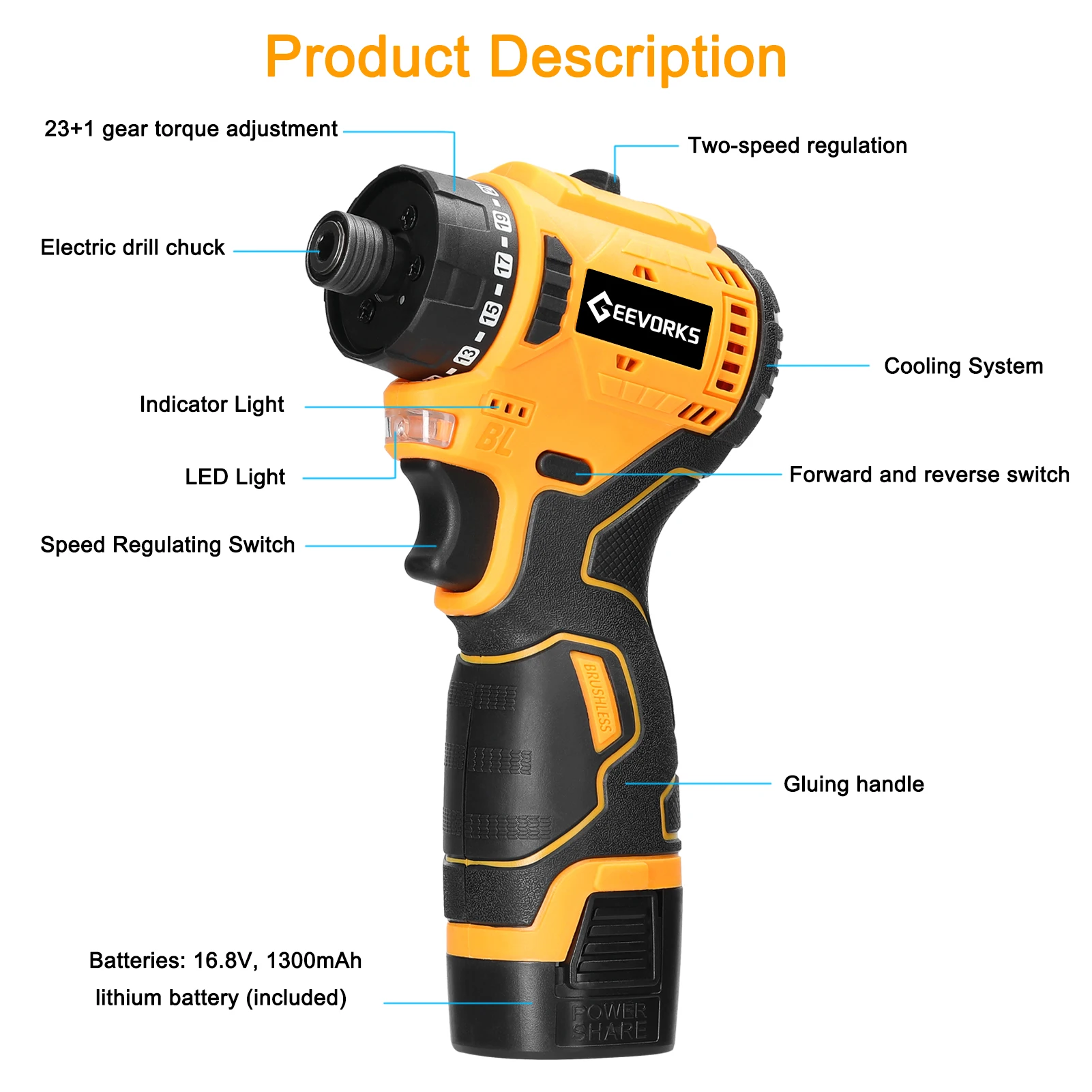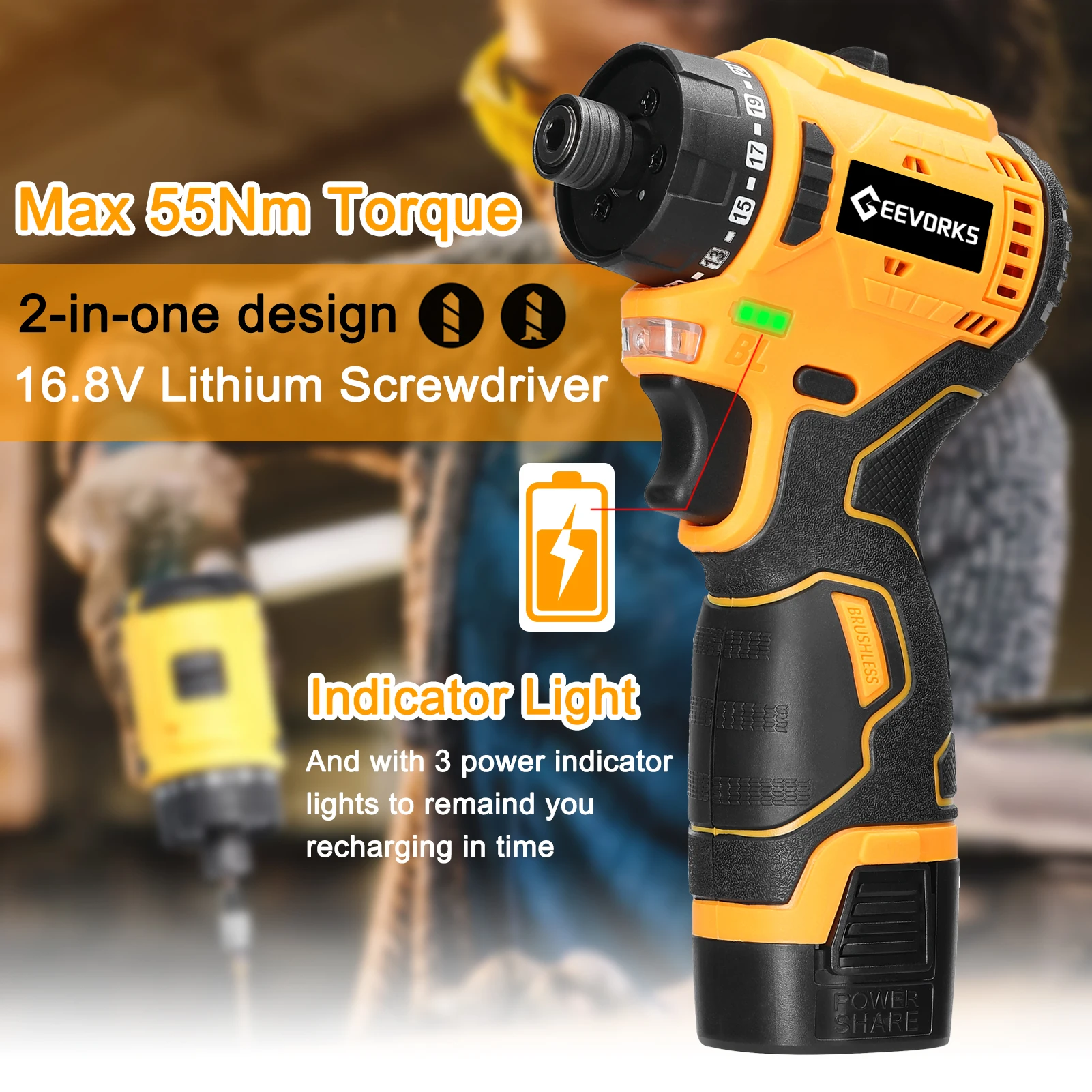 The 16.8V electric screwdriver can quickly tighten or loosen screws, providing enough power to complete most household or industrial applications. It uses a powerful magnetic brushless motor with a high torque of 55 Nm and a high rotation speed of 1500 rpm, which does not generate sparks during operation. There are two types of speed control modes: 2-speed regulation and stepless speed regulation to achieve the desired speed. Adjustable torque design with stable output torque. Using an electric screwdriver can increase efficiency and reduce the fatigue and time costs of manual operation for various types of screws. Suitable for tightening screws in the home in all scenarios: such as installing lamps, appliances, locks, and other disassembly.Characteristics: