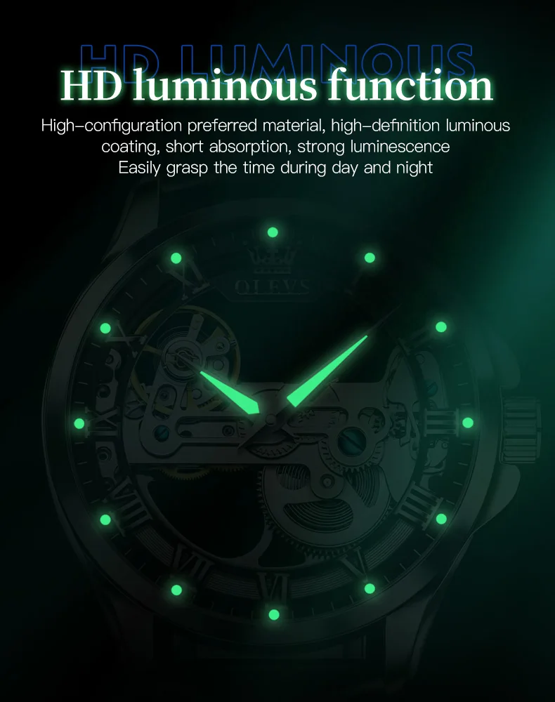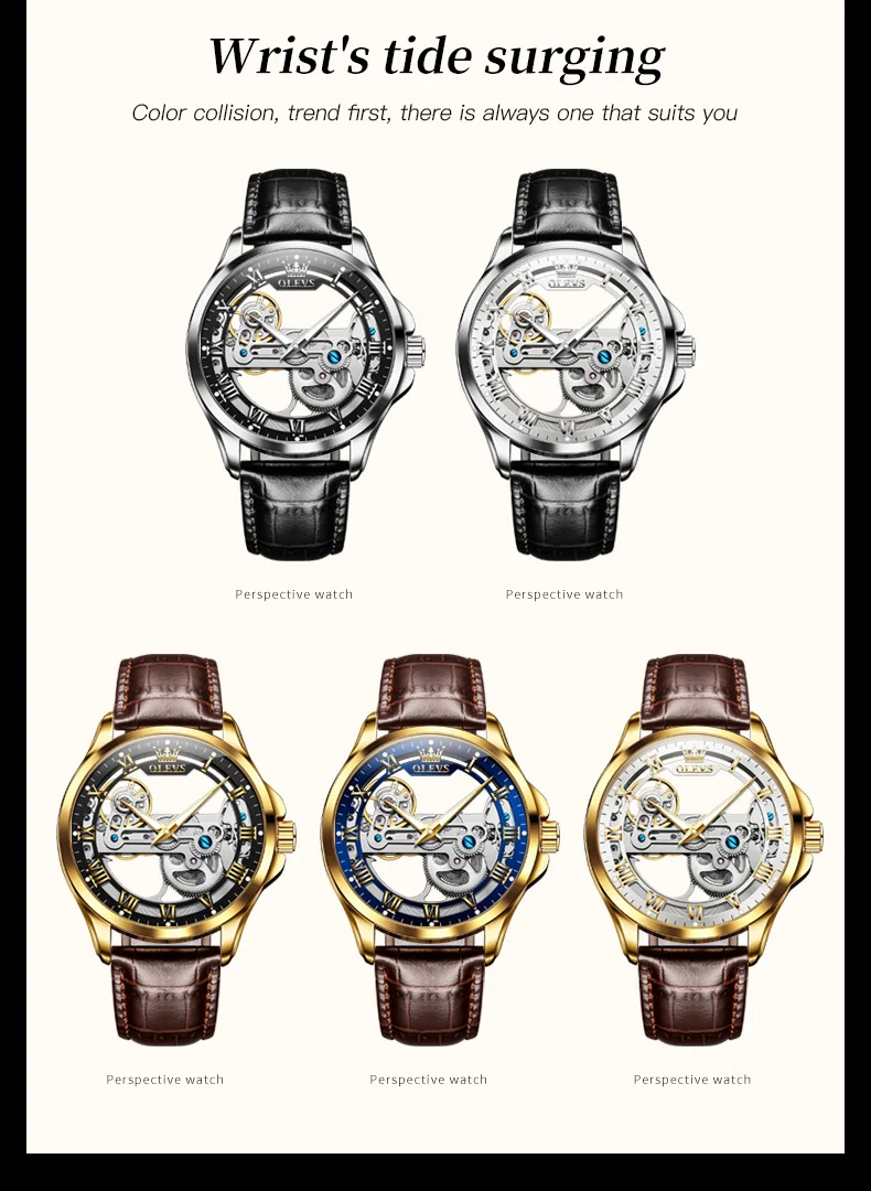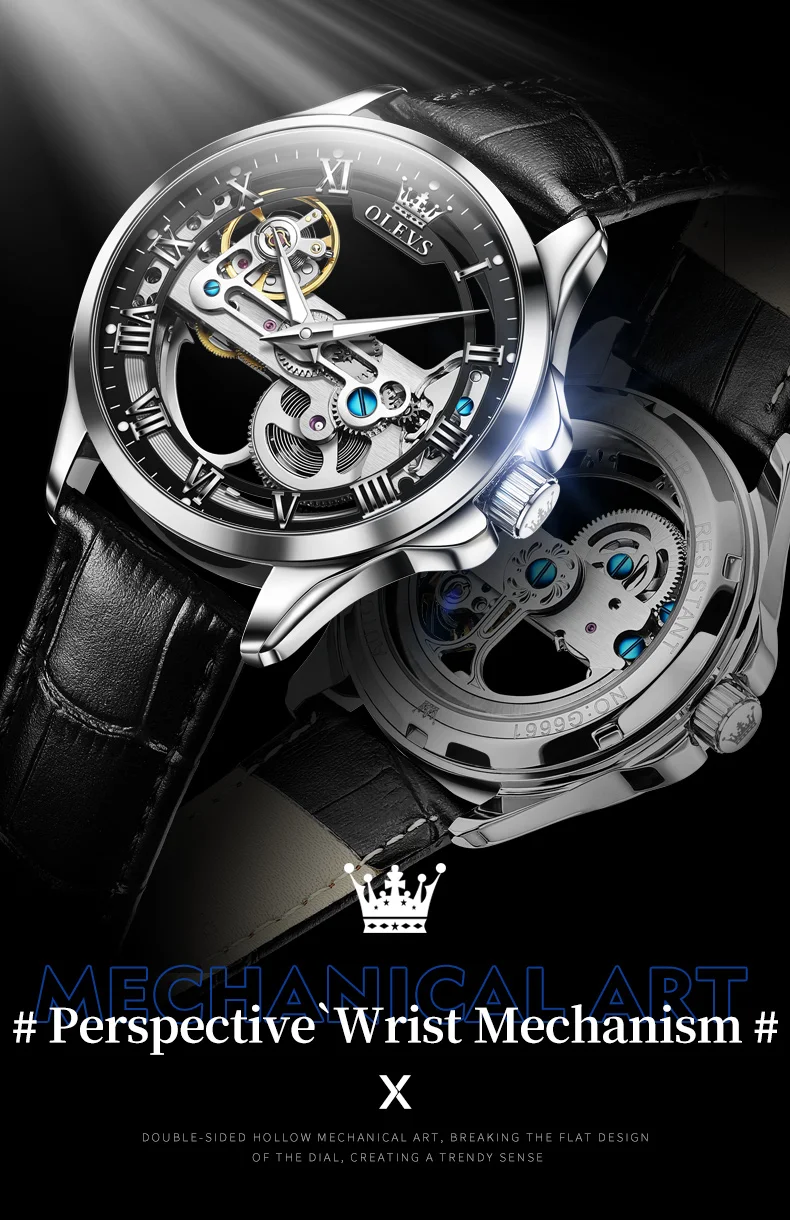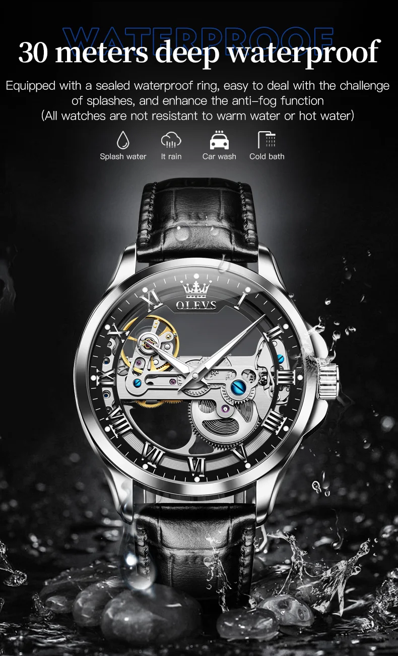 Orologio OLEVS Automatico Uomo – Scheletro Lusso con Cinturino in Pelle e Scatola Regalo